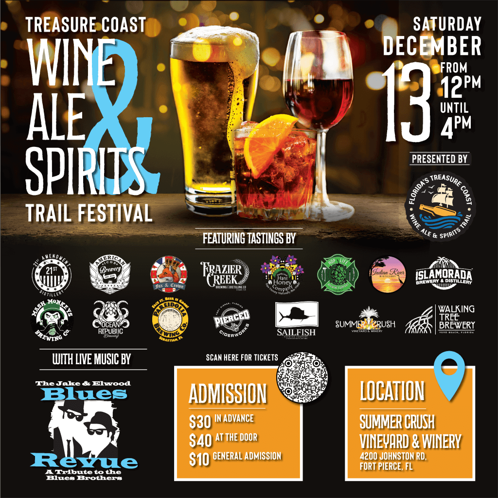 Sip, savor, and celebrate at the 6th Annual Treasure Coast Wine, Ale & Spirits Trail Festival! Enjoy unlimited tastings of craft beer, wine, cider, mead, and spirits from local favorites, all included with your ticket. Live music, including a high-energy performance by The Blues Brothers Revue, food trucks, a holiday vendor market, and a lively pavilion bar make this an unforgettable afternoon at Summer Crush Vineyard & Winery. For more information, visit their website!